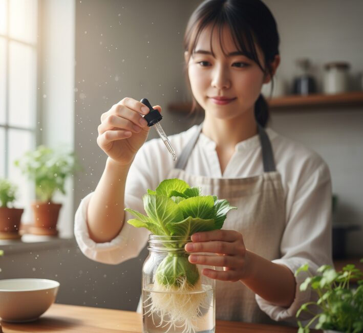 水耕栽培では、基本的に芯に残された養分だけで成長します。しかし、より多くの葉を収穫したい場合や、葉の色が薄くなってきたと感じる場合には、液体肥料で栄養を補給するのが効果的です。