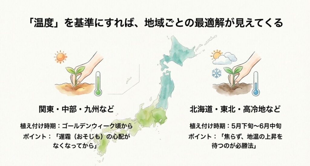 4月に植え付けができる地域や、北海道や東北など寒冷地での最適なタイミング、