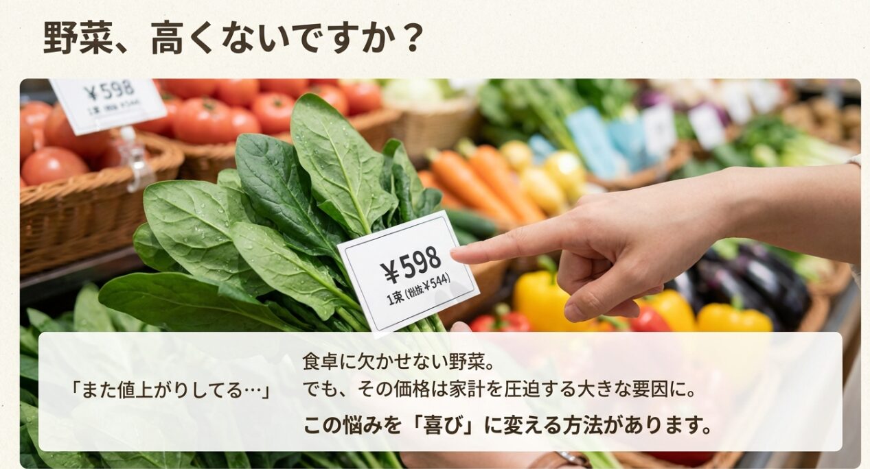 最近は物価高騰が続いていて、スーパーへ行くたびに野菜の値段に驚かされますよね。