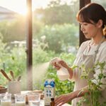 フェイジョア、ソヨゴ、セイヨウニンジンボク、ジンチョウゲといった手入れが楽で虫がつきにくいおすすめの庭木に囲まれた、手入れの行き届いた美しい庭でリラックスする日本人女性。モダンな住宅と調和し、穏やかなガーデニングライフを象徴している。